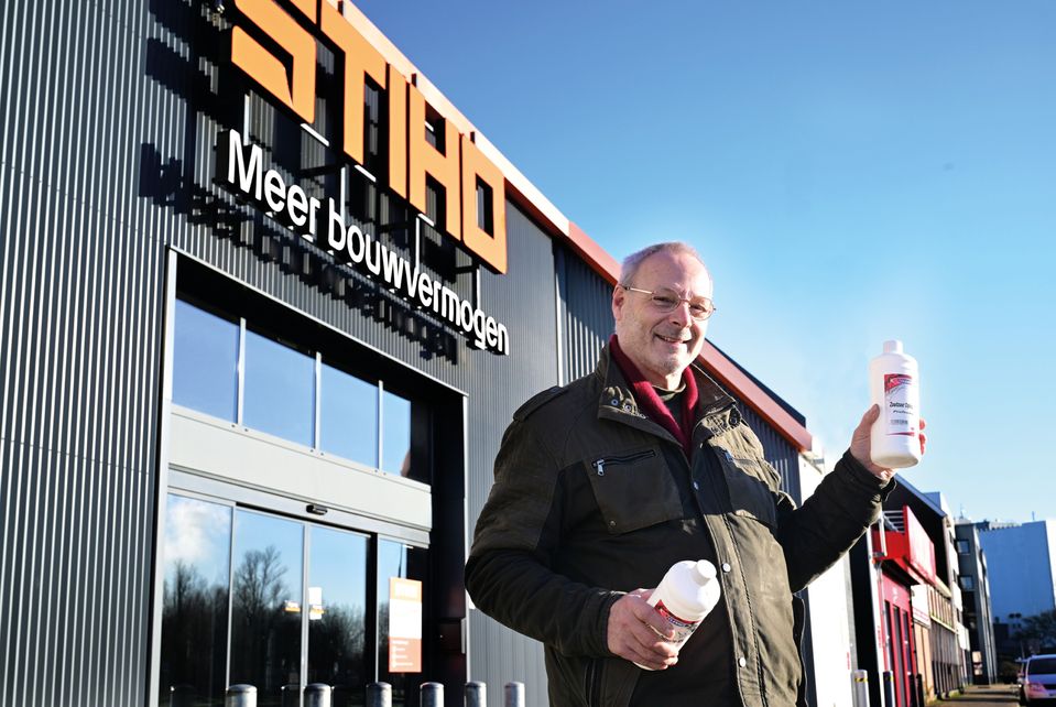 Hij werkt als beleidsmedewerker op assetmanagement bij drinkwaterbedrijf Vitens in een vestiging anderhalve kilometer verderop. “Ik ben de man van de rampen,” zegt hij met een glimlach. “Het is mijn taak onze organisatie goed voor te bereiden op bijvoorbeeld cyberaanvallen, natuurrampen en stroomuitval.” Hij is geen bouwprof, maar zeker wel een klusser en in die hoedanigheid winkelt hij gewoontegetrouw bij Hornbach. Waarom is hij dan hier bij Stiho? “Ik ben hier voor iets dat ik bij geen enkele andere bouwmarkt kan krijgen. Zoutzuur in een 10%-oplossing, ‘professioneel’ staat er op het etiket. Op zoek naar dit product ging ik het web op. Alleen PontMeyer en Stiho zouden het nog hebben.” Vanaf zijn werkplek is Stiho het dichtstbij; Pontmeyer is zo’n 200 meter verder. Het zoutzuur is niet voor zijn werk. Eric: “Nee, daar gebruiken we een 36%-oplossing en daar moet je wel mee oppassen. De 10%-oplossing kun je, met inachtneming van de veiligheidsvoorschriften op het etiket, best gebruiken. Een spatje op de huid prikt weliswaar, maar onze huid kan wel wat hebben hoor.” Eric studeerde chemische technologie. Zijn chemische kennis komt als een aap uit de mouw: “Ik ga de badkamer van kalk ontdoen en daar leent de 10%-oplossing zich goed voor, beter dan Antikal. Antikal werkt goed hoor, maar pakt alleen calciumcarbonaat aan. Het waas van calciumsulfaat en calciumfosfaat is eigenlijk alleen goed te verwijderen met zoutzuur. Gewoon met een sponsje.”